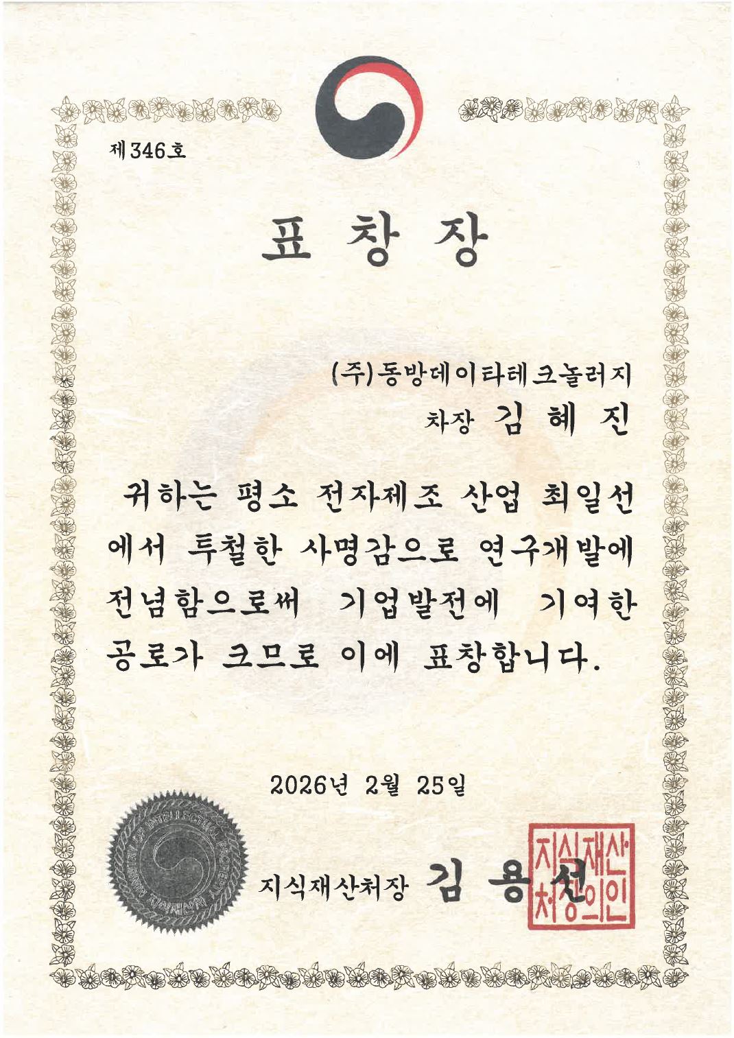 한국전자산업협동조합 지식재선처장 표창