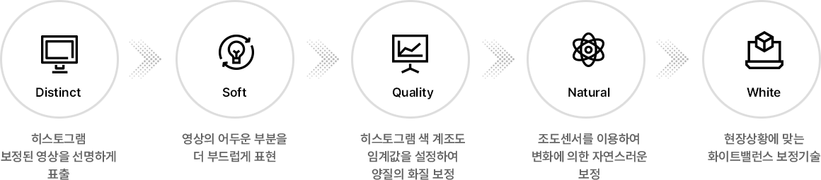 실시간으로 영상의 화면을 고속으로 캡쳐하여 표출될 화면의 히스토그램을 색 계조도의 임계값에 따라 보정하여 영상을 보다 더 선명하게 표출하는 영상제어 기술입니다.